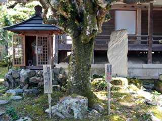 | この石は後醍醐天皇が腰かけた「腰掛石」で、後ろの木は楠木正行公がお手植の木斛(モッコク)です。 楠木正成の子・正行公(まさつら)が四条畷の決戦(足利の武将高師直との戦い)に向かう前、一族郎党143人と共に如意輪寺に参詣し、本堂の扉に鏃(やじり)で辞世の歌を刻み、四条畷に出陣しました。 |